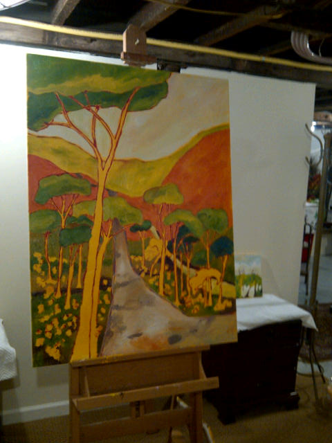 These are a new adventure, a departure from the Quotidian Angels – some friends will say, ‘Thank-you’. (smile). They are a return to landscapes. They all have two things in common: Two Paths. In Panel 1 there is the obvious stream – an old stream that once had a mill, hence the stone sides – but a walk path bisects the image at eye height. In Panel 2, again the obvious path climbs the hill centred in the image, but off to the right down in the valley runs a stream parallel to it. In Panel 3 (which I am least please with at this stage) the simple path divides into two – one heading up, the other descends to the right. Two paths that lead in and out of the canvases, towards and away, coming and going, here and not.